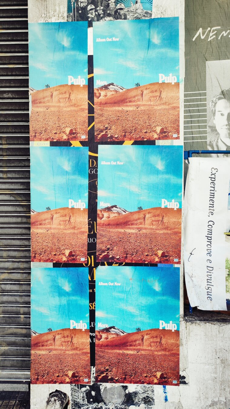 11:26 – Acho curioso esse hábito paulistano de colar capas de lançamentos musicais em lugares aleatórios: muro rachado, poste torto, portão de oficina. É guerrilha? É estética? É pra intrigar ou pra esquecer depois? Qual será o plano por trás do improviso?
